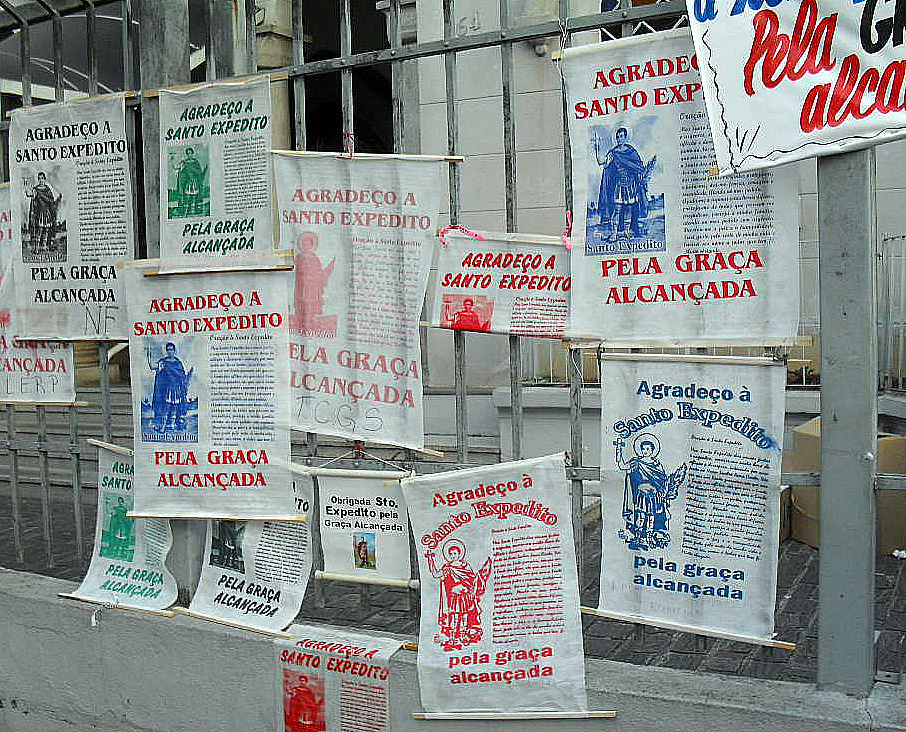 Tradicionalmente, devotos de Santo Expedito escrevem em placas agradecendo pela graça alcançada