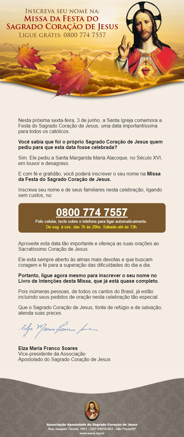 Sanou as suas dúvidas? Se sim, clique aqui para pedir a sua imagem do Coração de Jesus. Agora, se ainda tem alguma dúvida, envie um e-mail para nós. Nosso e-mail: atendimento@aascj.org.br